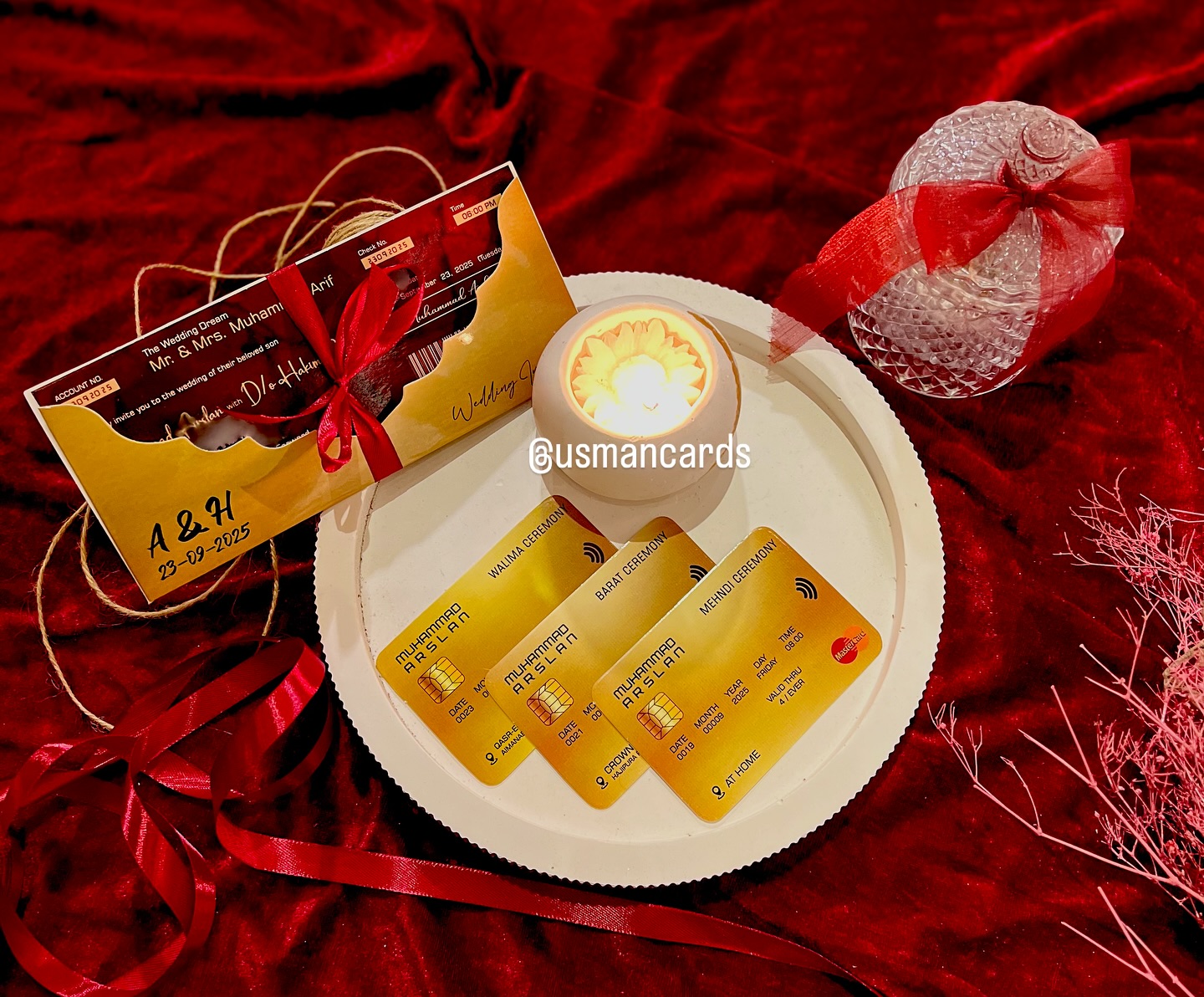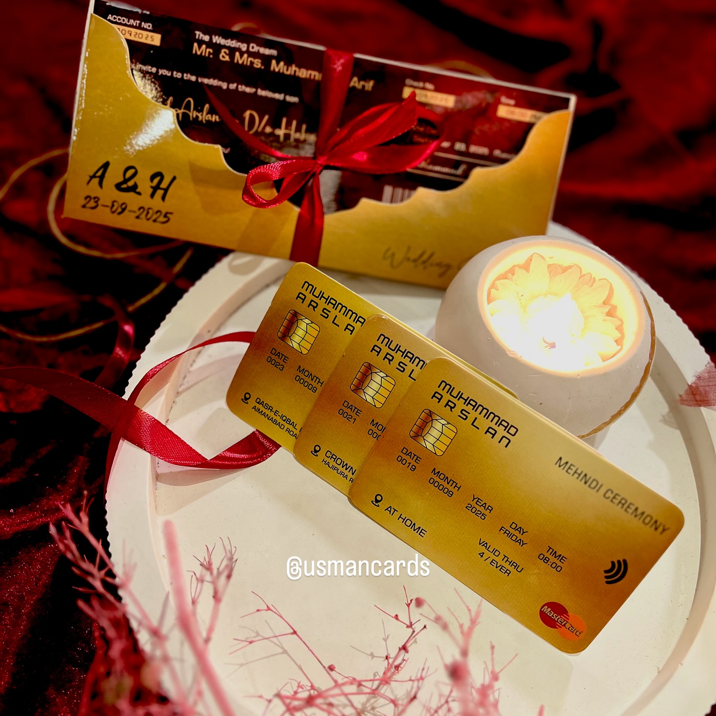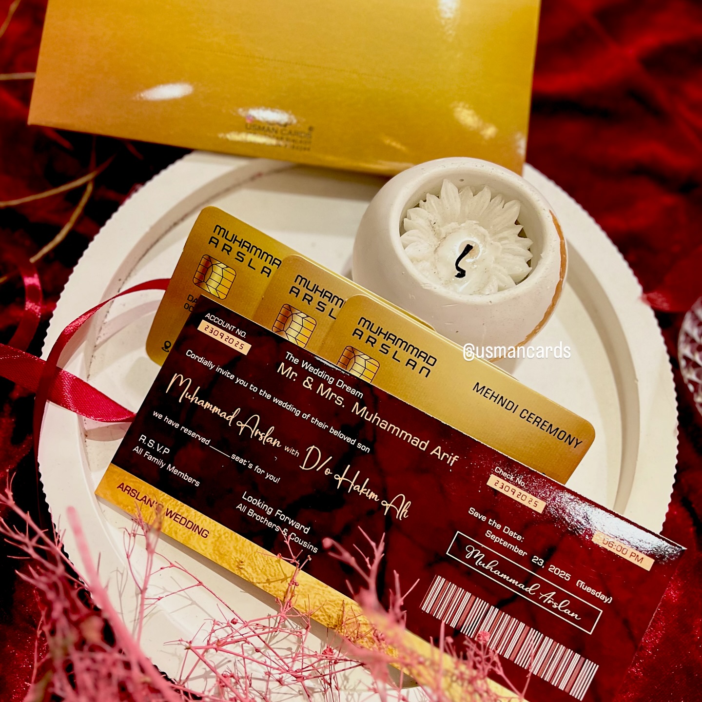 Credit Card Inserts: Event cards for the Mehndi, Barat, and Walima ceremonies are made to look like gold credit cards with customized names and dates.
