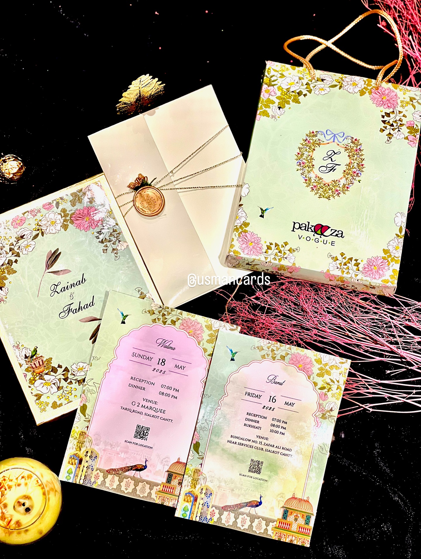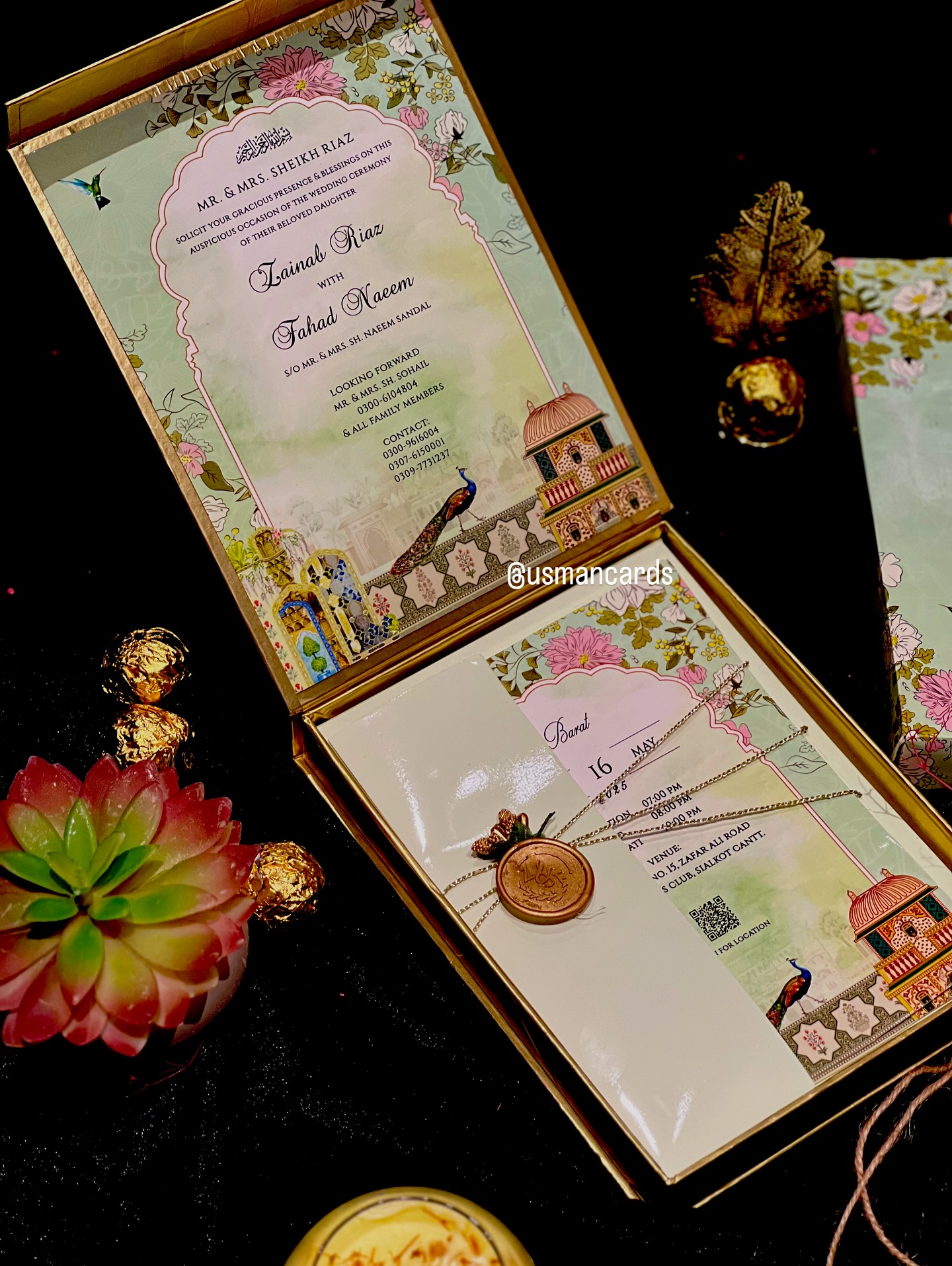 Box Invitation: A sturdy, hinged box in a mint green and gold color scheme, featuring charming traditional artwork like peacocks and royal architectural touches.