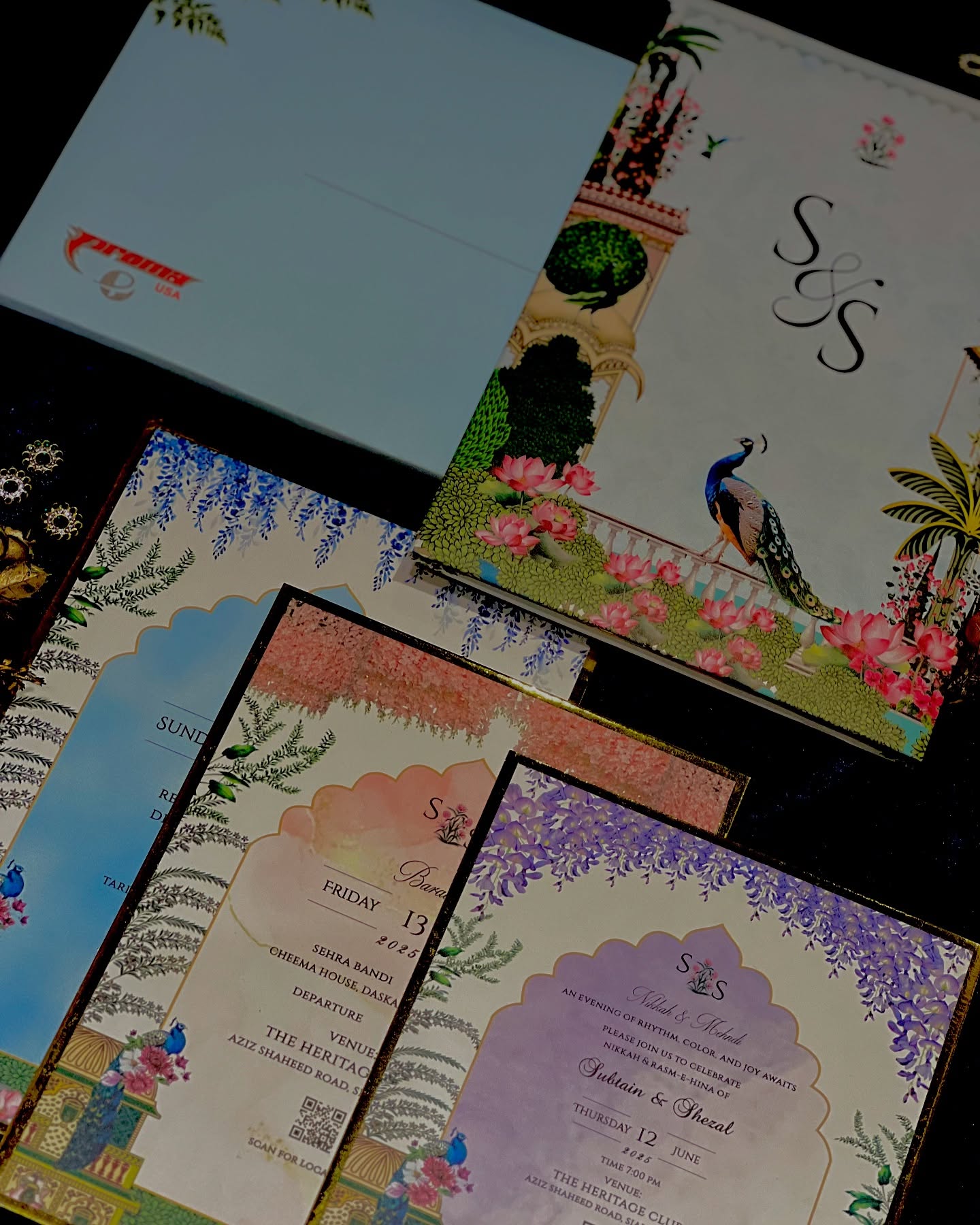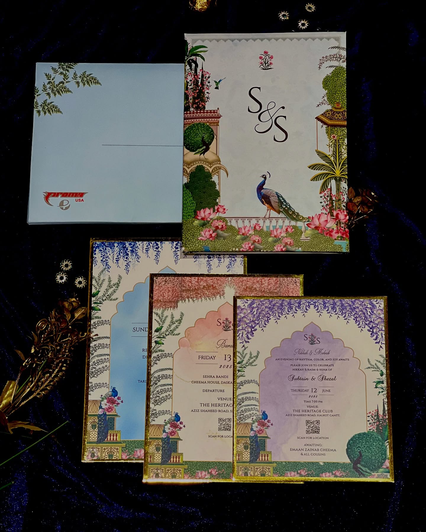 Artistic Theme: Features rich peacock and floral artwork on the folder and inserts.